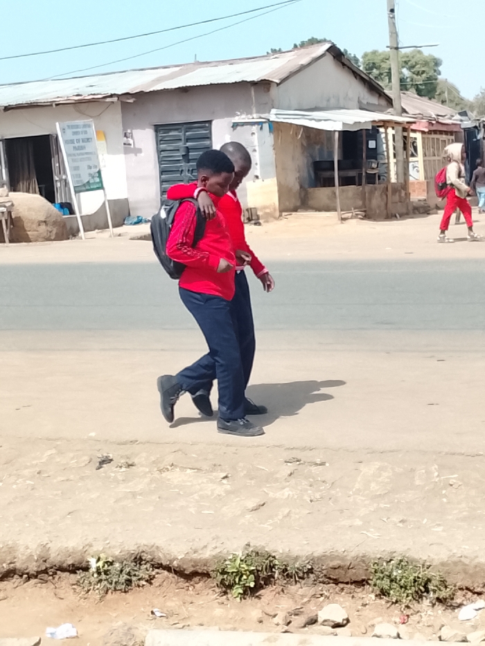 This image depicts a street scene in Jos, Nigeria, under clear, sunny daytime conditions. In the foreground, two young males, appearing to be students, walk from left to right on a dirt shoulder alongside a paved road. Both are dressed in identical red long-sleeved shirts and dark blue or black trousers. The male on the left wears a black backpack and black boots; his right arm is draped over the left shoulder of the male to his right, while his left hand holds the right hand or wrist of the same individual. The male on the right wears dark sneakers. The background features several single-story buildings with corrugated metal roofs. On the far left, a white sign with green lettering is visible, identifying one building as "PRESBYTERIAN CHURCH OF NIGERIA HOUSE OF MERCY PARISH." Another building has a dark, slatted metal gate. Further down the street on the right, a partial view of an additional individual, also wearing red attire and a red backpack, is observed walking in the same direction. The ground of the shoulder is dry and dusty with sparse patches of green vegetation and minor debris. A utility pole stands on the right side of the background. Shadows cast by the individuals and structures indicate strong sunlight.