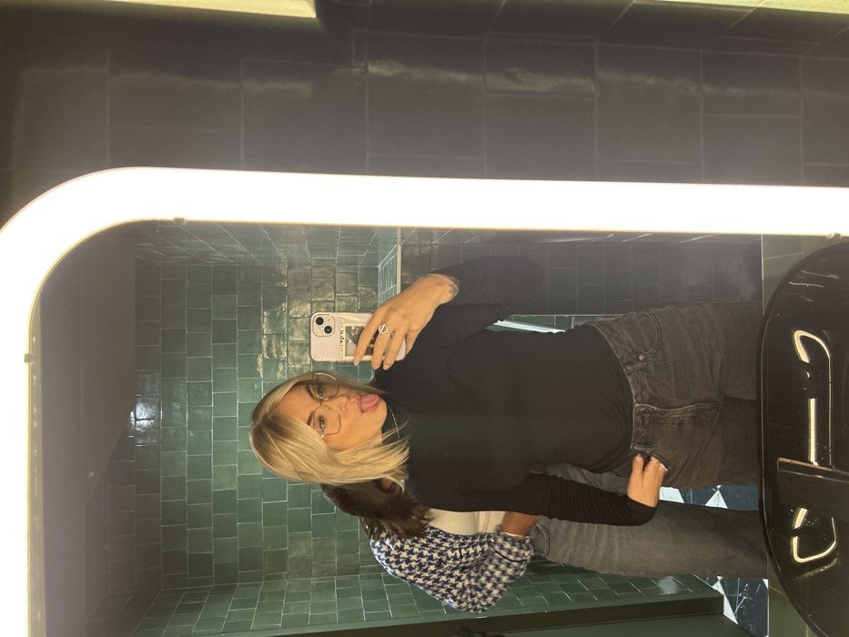 The image captures two women reflected in a mirror within what appears to be a modern bathroom. The walls are clad in dark teal/green rectangular tiles. The foreground subject, a woman with shoulder-length blonde hair and glasses, wears a black long-sleeved top and dark-wash jeans. She is holding a light-colored smartphone in her right hand, actively taking a mirror selfie, with her tongue extended in a playful expression. Multiple rings are visible on her left hand. Behind and slightly to the left of the foreground subject, partially obscured, is a second woman with dark hair. She is dressed in a white top, a blue and white patterned jacket, and light-colored jeans. The mirror itself is large, rectangular with rounded top corners, and features a prominent vertical LED light strip integrated into its right edge. A black sink counter is visible in the lower portion of the frame. The specific establishment or precise location within Saint-Étienne, France, is not identifiable from the visual content of this image.