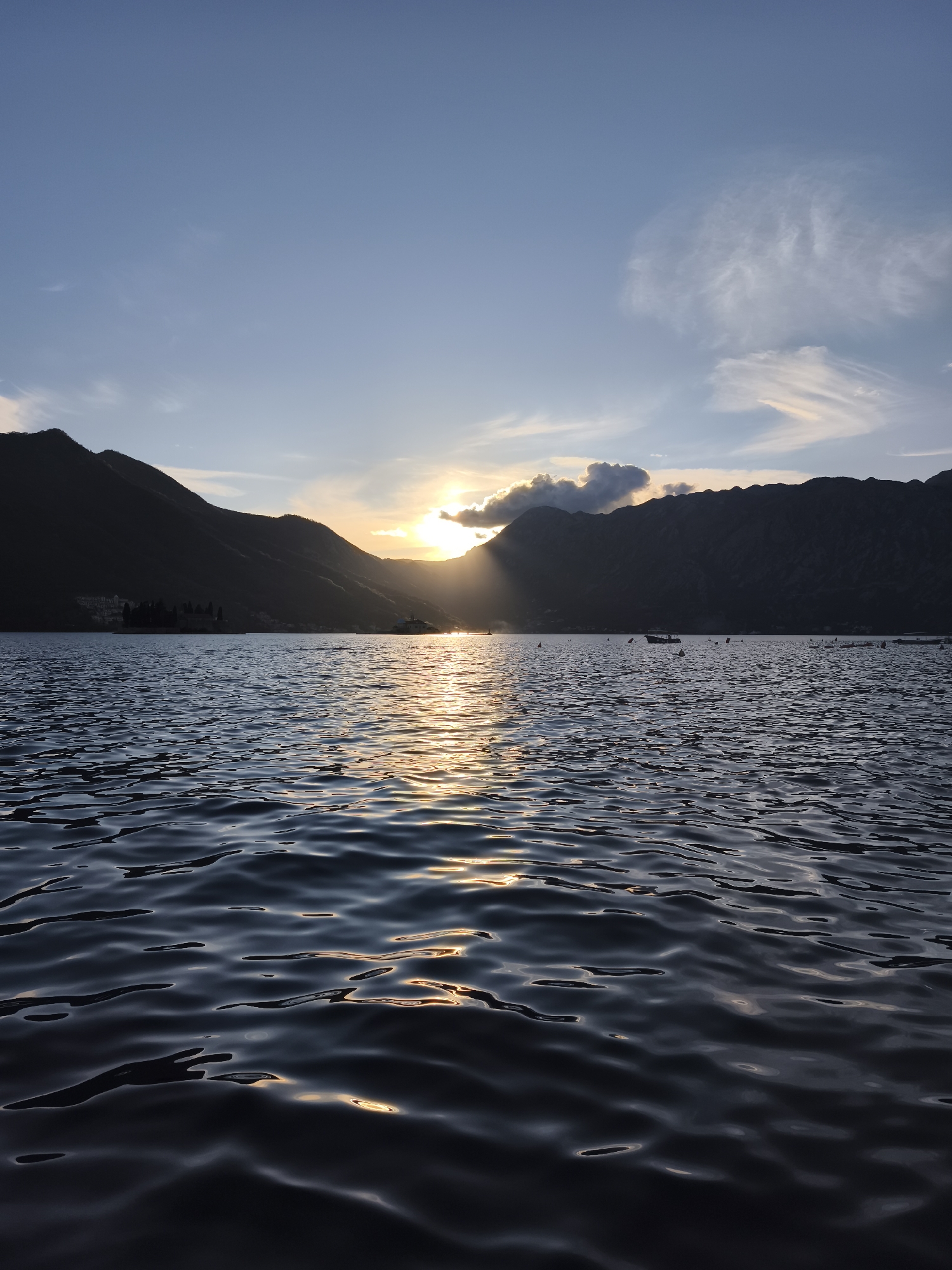 The image captures a sunset over the Bay of Kotor, Montenegro, likely near the city of Perast. The foreground is dominated by the rippled surface of the water, reflecting the light of the setting sun. The water is dark, with golden highlights dancing across the waves. In the midground, dark, silhouetted mountains frame the bay. The sun is partially obscured by clouds or the mountain peaks, casting rays of light across the water. Several small boats and buoys are visible on the water's surface in the midground. The sky transitions from a light blue near the horizon to a deeper blue at the top of the frame, with wispy clouds adding texture. The overall scene is one of tranquility and natural beauty.