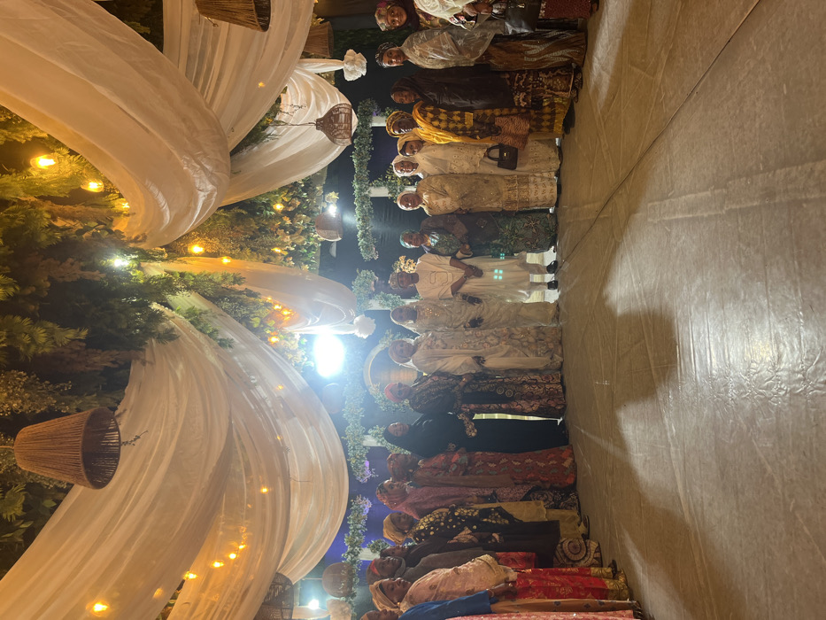 A group of people wearing traditional clothing stand in a line in an ornate setting. White fabric drapes overhead with lights interspersed. Vegetation is visible among the drapes, along with woven baskets. The ground appears to be covered with a white surface. The people are arranged shoulder to shoulder, facing forward.