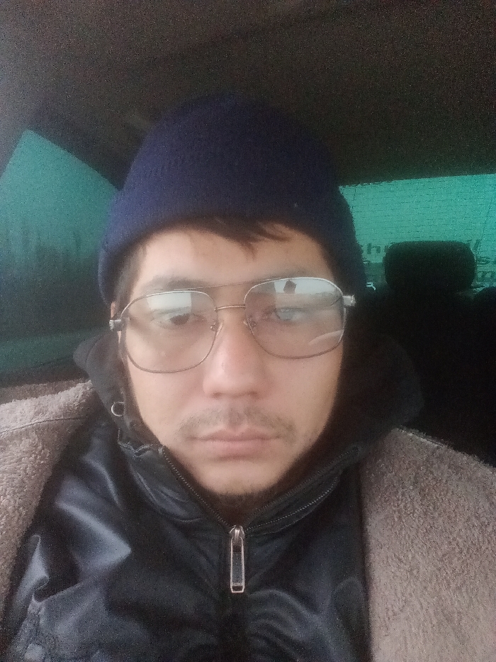 A selfie of a man wearing glasses and a blue beanie. He has dark hair and a mustache. He wears a black jacket zipped up and a tan coat. The background appears to be the interior of a car, with a tinted rear window and a headrest visible. The lighting is somewhat dim, casting shadows on his face.