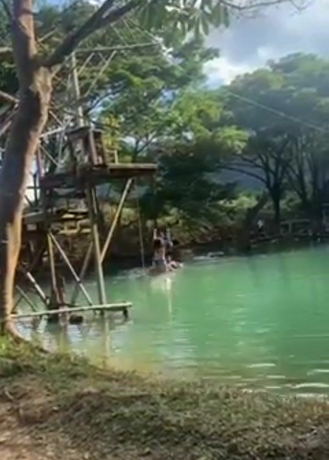 person jumping into a clear, green-tinted lake from a tall, wooden diving platform. The platform is located on the edge of the lake, and is framed by trees and other vegetation. Several other people are visible in the water, some on inflatable tubes. The day appears sunny with partial cloud cover.