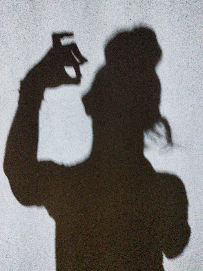 - "The image displays a dark silhouette of an individual's upper body, head, and arms, projected onto a light-colored, granular surface" by FM-6IJBE3, licensed under CC BY 4.0