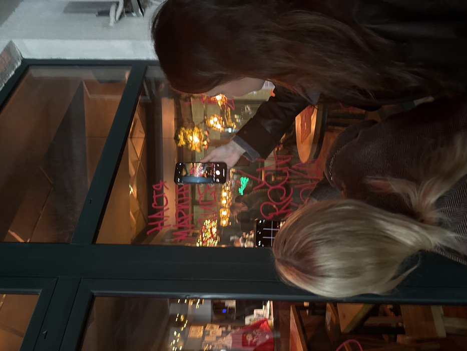 Two people stand outside a window, each holding a smartphone. The person on the left has long, dark hair and wears a dark jacket with light sleeves. They are photographing writing on the window. The person on the right has short, blonde hair and wears a tweed coat. The writing on the window is in red and includes the words "ROCK ROOM." Through the window, the interior of the room is visible, including lights and patrons.