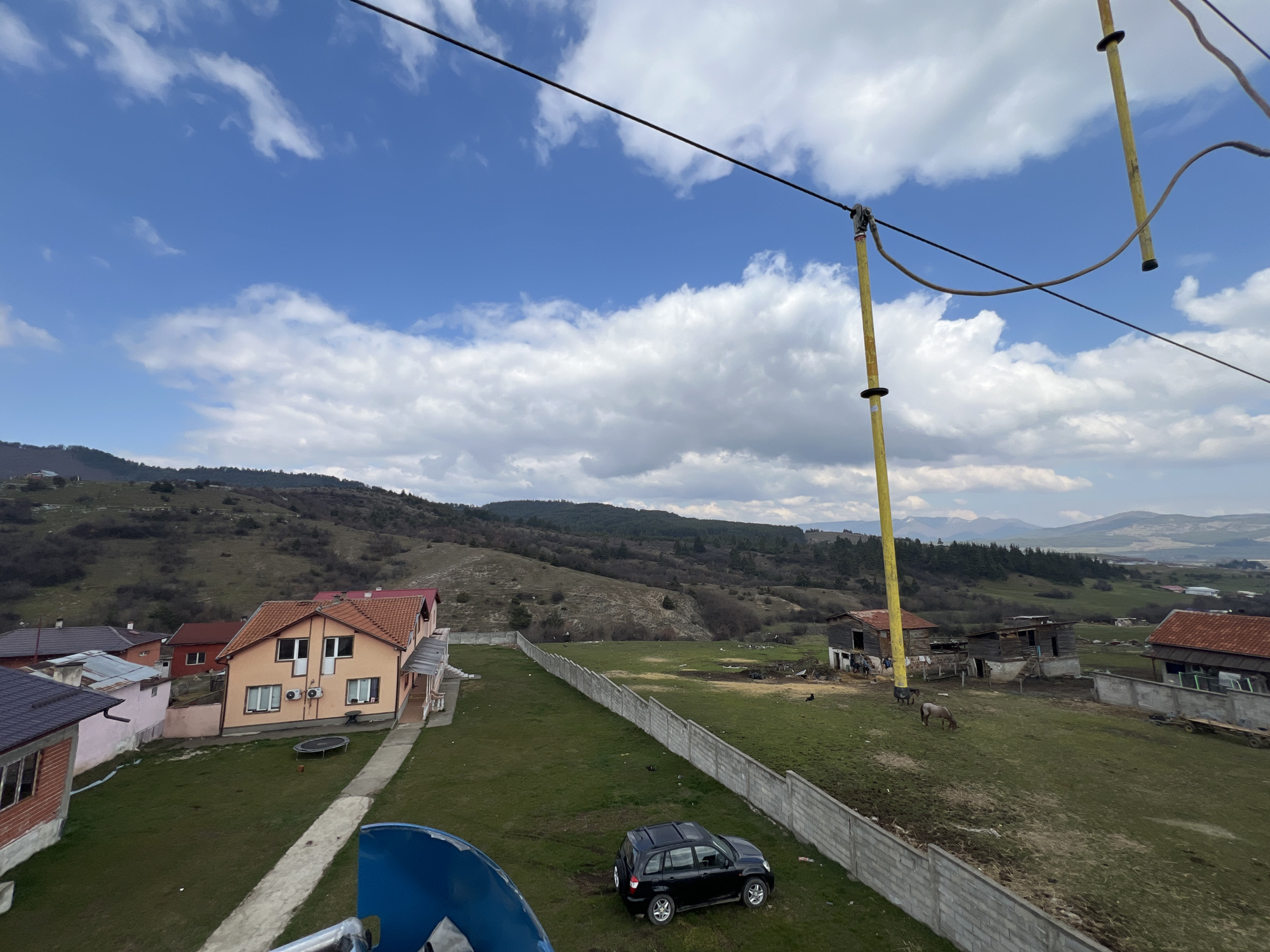 The image depicts an elevated view of a semi-rural landscape in Rakitovo, Bulgaria, under a partially cloudy blue sky with scattered white cumulus clouds. In the foreground, a partial blue structure is visible at the lower left. A black compact SUV is parked on a manicured green lawn, adjacent to a narrow concrete pathway that leads towards an orange two-story house with a red-tiled roof, white-framed windows, and two external air conditioning units on its side. A trampoline is situated on the lawn next to this house. Several other residential buildings with varied roof colors are partially visible to the left and behind the orange house. A long, segmented gray concrete block fence runs diagonally from the mid-left to the mid-right, separating the closer residential area from a more expansive green field with patches of bare earth. Beyond this fence, two horses (one dark gray, one light brown) are grazing in the field. Further to the right, several rustic wooden barn-like structures with dark roofs are present. Indistinct human figures are visible near one of these wooden structures, and a dark bird is on the ground nearby. Overhead, black utility cables extend horizontally across the upper portion of the frame, supported by yellow vertical poles. One prominent yellow pole extends downwards from a cable near the center-right, and a curved brown cable is also visible in this overhead network. The background consists of rolling hills and mountains, sparsely vegetated with grass, bushes, and patches of forest, extending towards a distant mountain range under the cloudy sky.