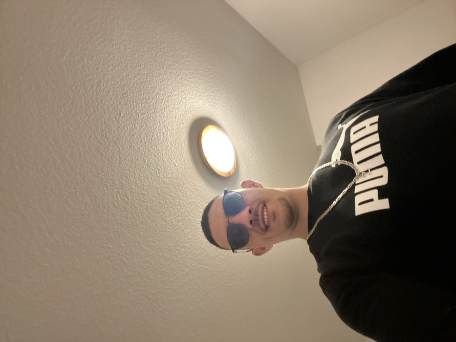 A man wearing black sunglasses and a black Puma sweatshirt smiles at the camera from below. He is wearing a silver chain necklace. A ceiling light is visible on the wall behind him. The wall and ceiling are off-white. The photo is taken at an extreme upward angle.