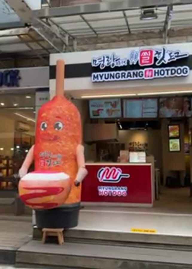 The camera pans slowly from left to right across the street, showing storefronts in front of which there are promotional objects. On the left, the first storefront is for Myungrang Hotdog. There is a smiling corn dog figure in front of the store. Next to it, the adjacent storefront advertises Fried Chicken Master.