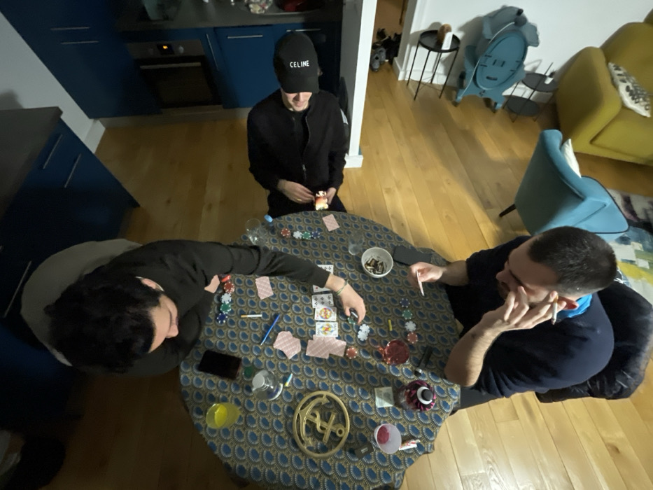 The scene depicts an indoor residential setting, likely an apartment in Paris, France, characterized by hardwood flooring and an adjacent kitchen area with dark blue cabinetry. Three adult males are gathered around a circular table covered by a dark blue and light blue patterned tablecloth, engaged in a card game, possibly poker, evidenced by multiple stacks of colorful poker chips and numerous playing cards spread across the table. **Individuals:** 1. **Subject 1 (Top-center):** A male with dark, short hair, wearing a dark long-sleeved shirt, is leaning over the table, extending his right hand towards a group of cards and chips. 2. **Subject 2 (Bottom-left):** A male with short dark hair and a beard, wearing a dark blue shirt, is holding a lit cigarette to his mouth with his right hand. His left hand is raised towards his face. 3. **Subject 3 (Right-middle):** A male wearing a black jacket and a black baseball cap with "CELINE" in white text is seated further back, observing the table. He holds a small, multi-colored object in his hands. **Objects and Environment:** On the table, alongside the cards and chips, are a black smartphone, a clear glass containing a yellow liquid, several unlit cigarettes, an ashtray with cigarette butts, a clear glass bottle, a golden decorative object (possibly an anchor or a stylized letter), and a small red container. The immediate background includes a light blue upholstered chair and part of a yellow armchair. The far background reveals a kitchen section with dark blue upper and lower cabinets, a white countertop, and a built-in silver oven/microwave. A white shelf or counter in the mid-right holds additional small objects, including a black wire rack. The image is captured from an elevated perspective. The exact location within Paris is not discernible from the provided interior details.