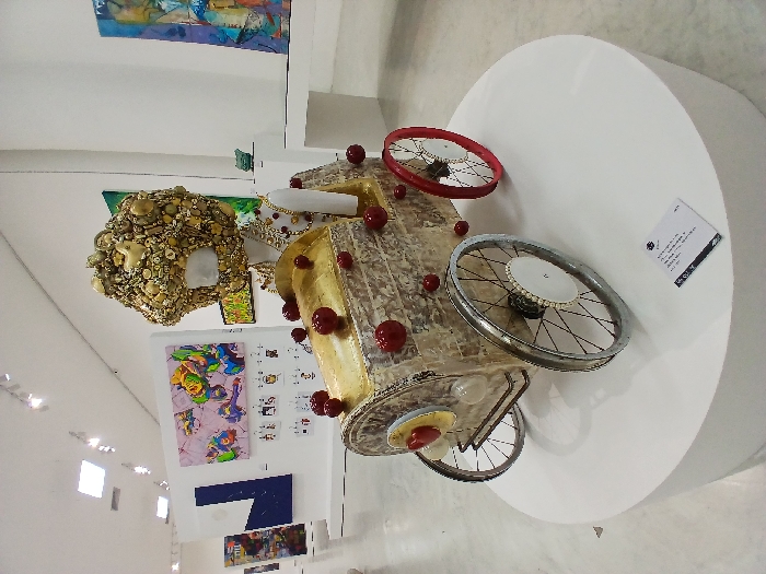 A quirky sculpture sits atop a round, white pedestal in an art gallery. The sculpture incorporates various materials, including what appears to be a ceramic or mosaic-like head adorned with shells or beads, and a rectangular body embellished with red spherical objects. Three bicycle wheels of different sizes are integrated into the structure, two mounted on top and one below, giving it a whimsical, mobile-like quality. The gallery space is bright, with other artwork visible in the background.