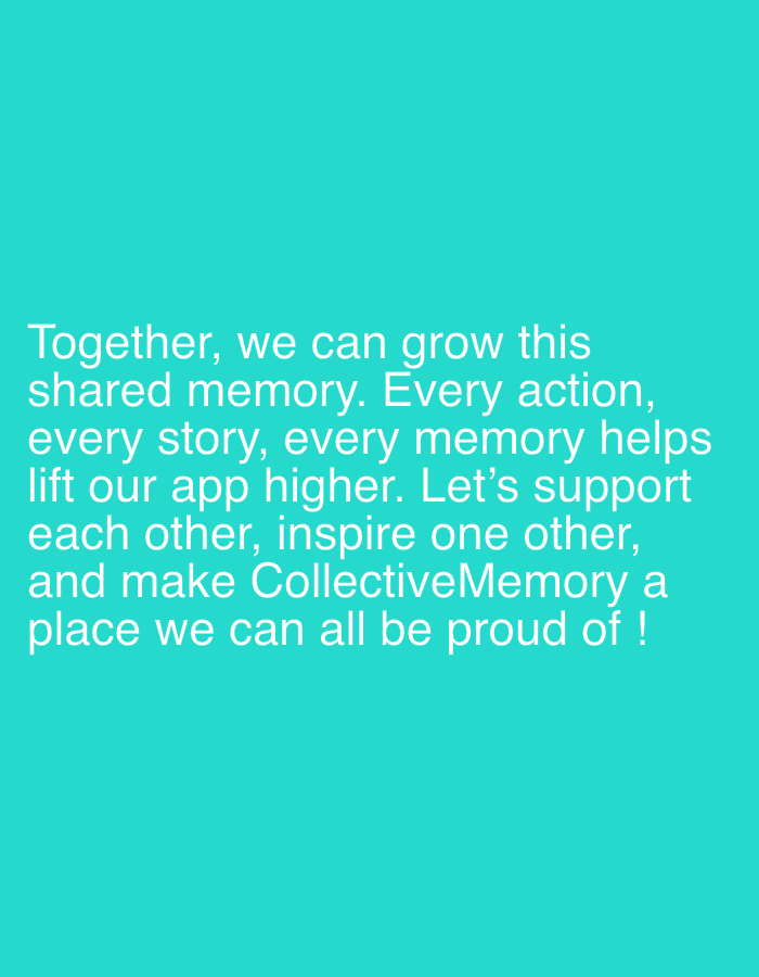 The image displays a message in white text against a vibrant teal background. The text reads, "Together, we can grow this shared memory. Every action, every story, every memory helps lift our app higher. Let's support each other, inspire one other, and make CollectiveMemory a place we can all be proud of!" The message promotes unity, support, and a shared sense of accomplishment related to the app "CollectiveMemory."