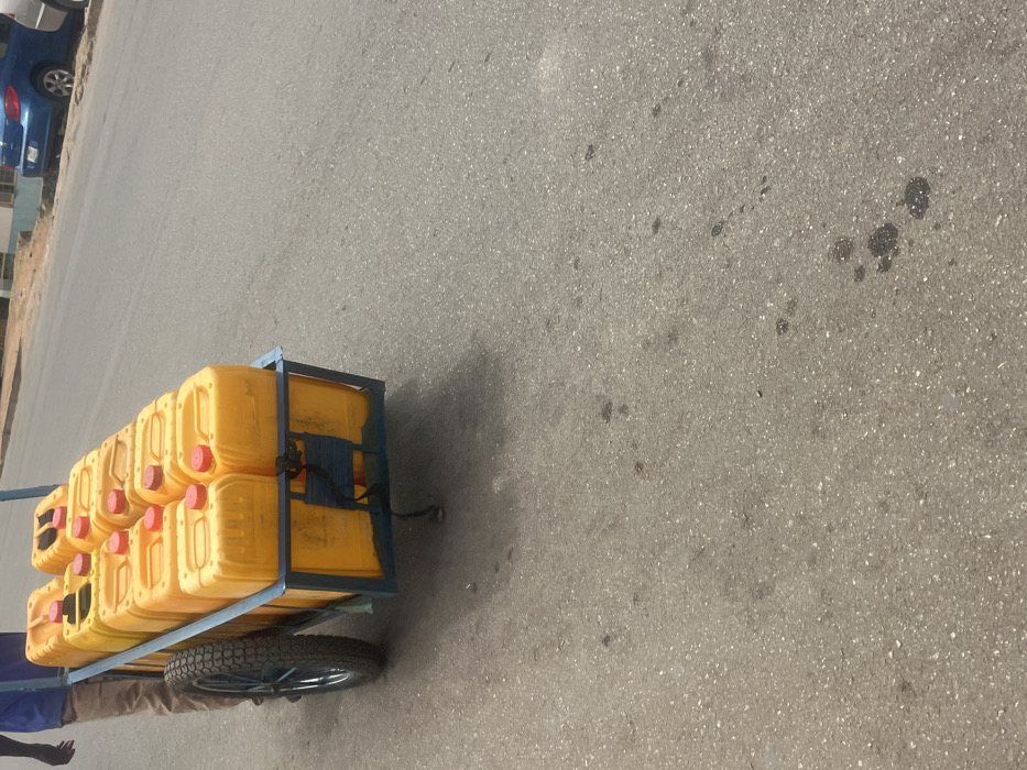 An outdoor scene in Jos, Nigeria, depicts a dark-skinned individual from the chest down, wearing a blue shirt and light brown trousers, pushing a blue-framed, two-wheeled handcart along a gray asphalt road. The cart is heavily loaded with ten bright yellow rectangular plastic jerrycans, each with a red screw cap, stacked in two rows. The jerrycans appear secured by dark straps, and some exhibit minor scuff marks or displaced caps. A kickstand is visible on the rear of the cart. The asphalt road surface shows scattered dark stains, possibly from oil or liquids. In the background on the right, a blue sedan is parked parallel to the curb, with a light-colored building partially visible behind it.