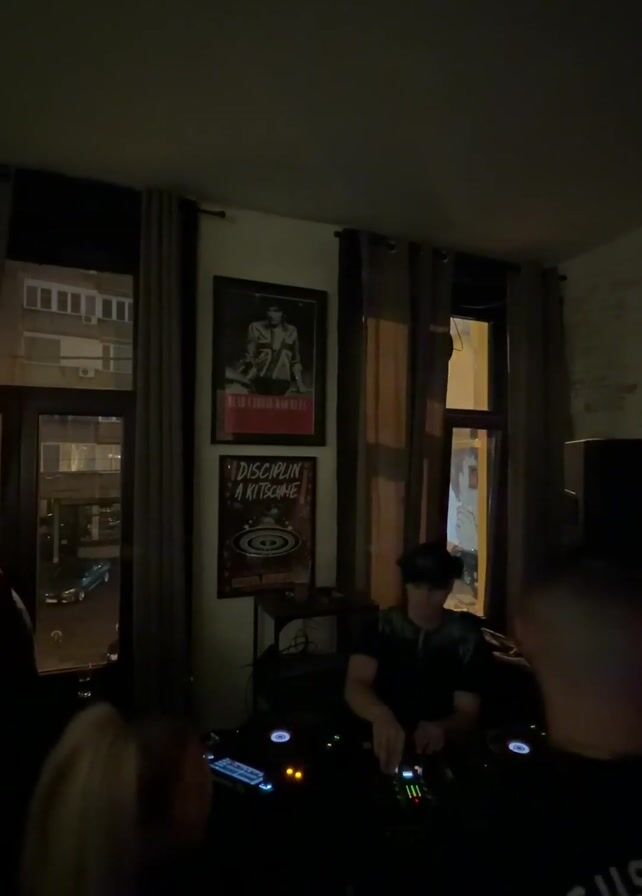 A DJ is playing music in a dark room. There are two posters on the wall behind him. One has a picture of a man in a suit and the other has the words "DISCIPLIN A KITSCHME". There are people in front of the DJ, presumably enjoying the music. There is a window to the left showing buildings and a street outside.