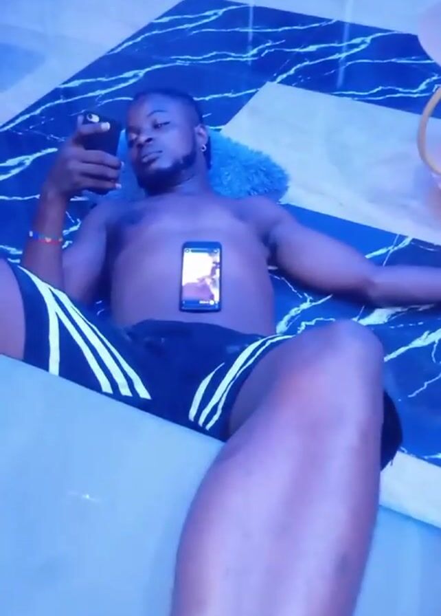 A man is lying on his back on a black-and-white marble patterned rug. He's shirtless, wearing black shorts with white stripes. He is holding a cell phone in his right hand and looks at the screen. Another cell phone is lying on his abdomen displaying a video. A small blue cushion is beneath his head. In the background, there is a side table with a water bottle. The scene is lit with a blueish light. Music is audible.