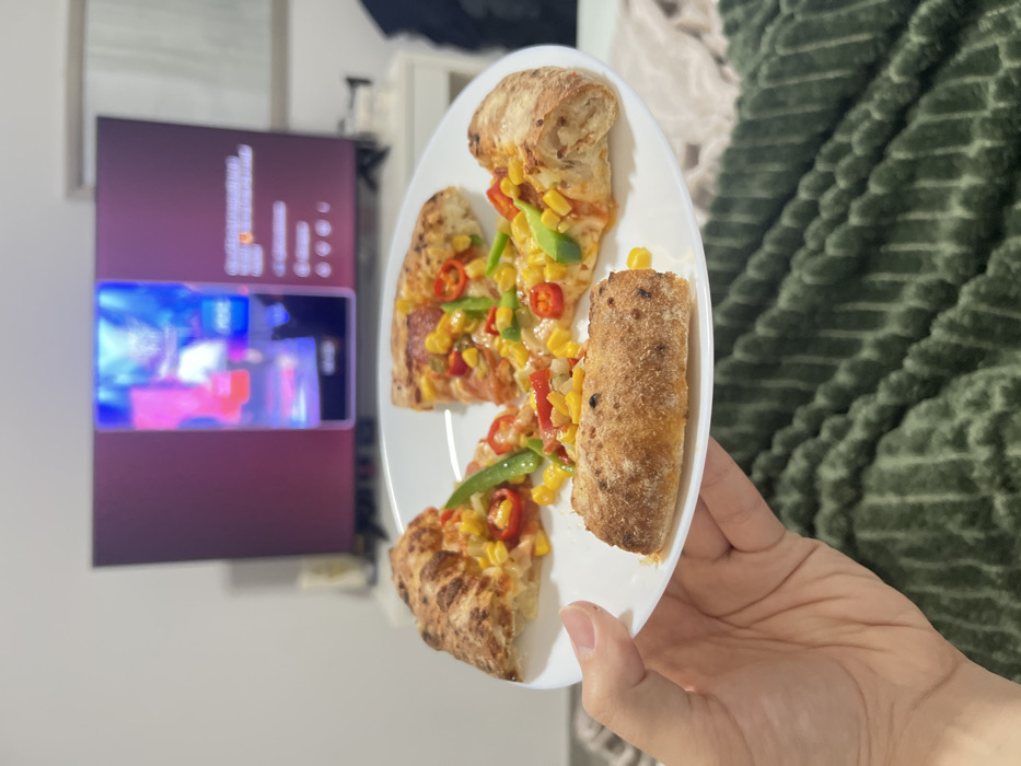 The scene depicts an indoor setting, likely in Mogán, Spain, featuring a person's hand holding a white, circular plate in the foreground. The plate contains four irregularly cut slices of pizza and one detached crust piece. The pizza toppings include melted cheese, numerous yellow corn kernels, sliced green bell peppers, and sliced red chili peppers on a tomato sauce base, with a thick, rustic crust. In the mid-ground, a flat-screen television is visible on a white cabinet against a light-colored wall. The television screen displays a vibrant, abstract image composed of blues, purples, and reds, along with some visible user interface elements on the right side. The lower portion of the image reveals a ribbed, dark green blanket, with a lighter-colored, textured blanket partially visible to its right.