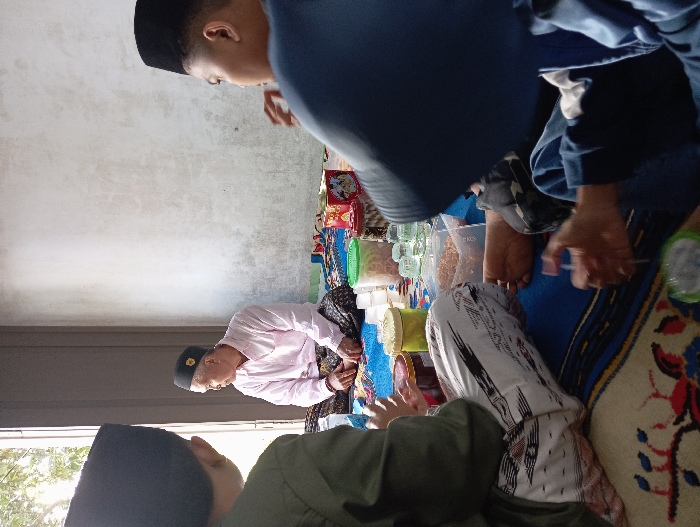 The image depicts an indoor scene in Bulukandang, Indonesia, featuring three individuals seated on a patterned blue mat overlaying a floral rug