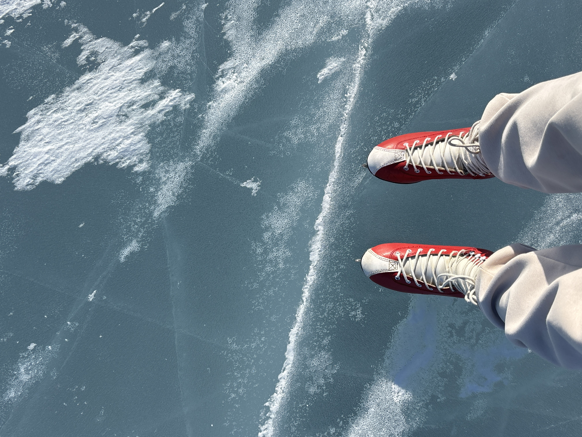 The image presents a first-person, downward-facing view of an individual's lower legs and feet on the frozen surface of Lake Baikal in Listvyanka, Russia. The subject wears light-colored (beige or light grey) trousers with visible folds and creases. On their feet are a pair of ice skates, distinguished by red main boots with white toe caps and lacing panels, secured by white laces. The expansive ice surface is a translucent bluish-green, exhibiting multiple linear cracks and diverse textures. Irregular patches of opaque white, frosty, or snow-dusted ice are interspersed across the otherwise clear frozen water. The scene is brightly illuminated, indicating direct daylight conditions.