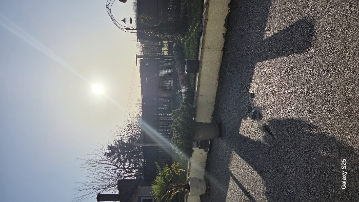 The image depicts an outdoor scene in Ottonville, France, characterized by low sunlight and long shadows, indicating either early morning or late afternoon. The foreground features a dark grey-and-white speckled paved surface, across which multiple dark, elongated shadows are cast from objects outside the frame to the left and from potted plants. A small, dark object with a light blue component is visible on the paved surface near the center-right. A low, light-colored retaining wall, showing signs of wear and cracking, divides the paved area from a garden beyond. On the paved side of this wall, from left to right, are two large potted plants: a white pot containing a green, palm-like plant and a dark pot holding a dense, bushy evergreen shrub. A smaller, dark, seemingly empty pot rests on top of the retaining wall further to the right. Behind the wall and a patch of green lawn, a dark wooden privacy fence or screen stretches across the midground. Behind the fence, deciduous trees with bare branches are visible. To the far left, a portion of a house with a prominent dark chimney is present. To the far right, an ornamental dark metal arbour or archway stands, from which two small, dark decorative objects, possibly bird cages or lanterns, are suspended. The upper portion of the image is dominated by a clear, light blue sky. The bright, low-angle sun is positioned slightly right of center, producing a strong lens flare and distinct light streaks across the sky. The text "Galaxy S25" is visible in the lower left corner. No individuals are present in the scene.