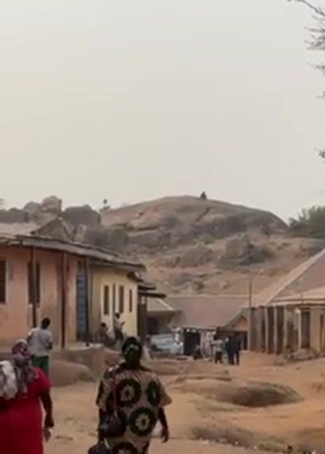 A static shot shows a dusty village street in Africa. Several people walk on the dirt road, some carrying things. There are small, simple buildings on either side of the road. In the background is a large, rocky hill with a person visible on top. The sky is overcast, creating a hazy, muted atmosphere. The scene appears to be a snapshot of daily life in a rural African community.
