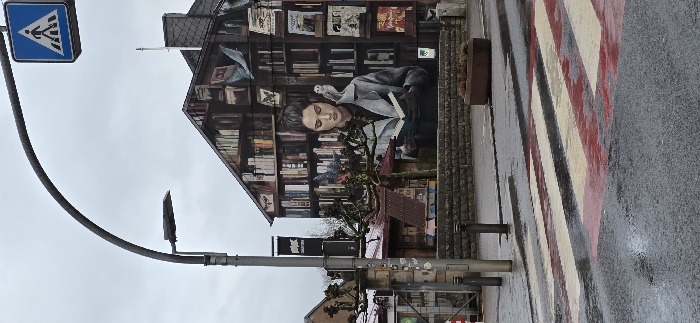 A mural depicting a woman reading a book with an owl perched on her shoulder covers a building façade. The mural is set against a backdrop of bookshelves. A crosswalk with red and white stripes is visible on the street. A pedestrian crossing sign is mounted on a metal pole in the foreground. The sky is overcast.