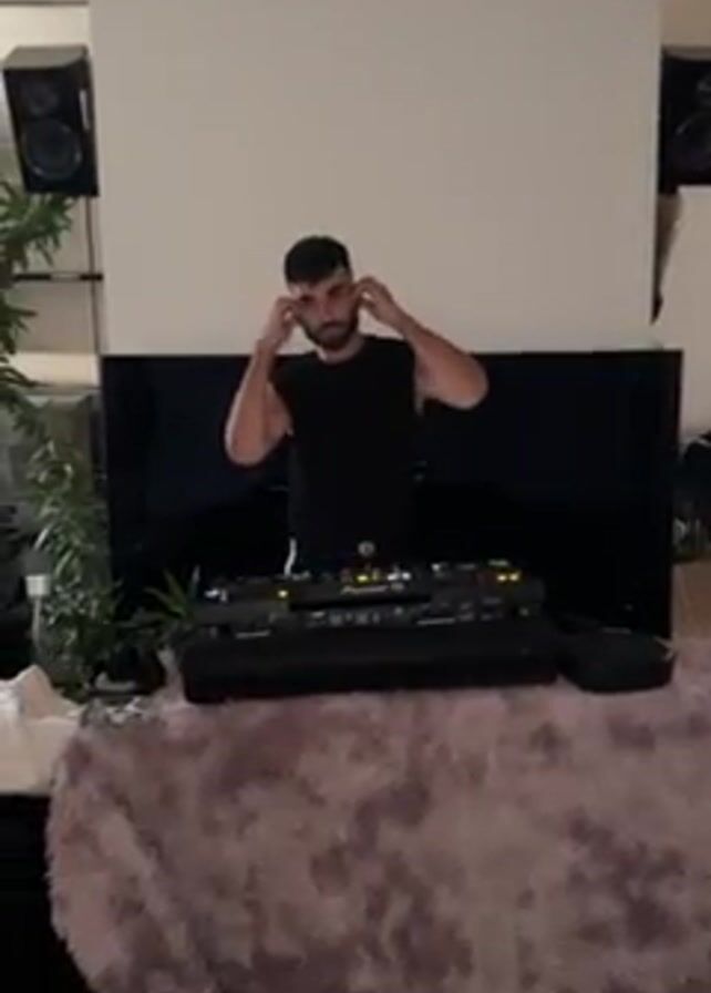 A man is mixing music on a Pioneer DJ deck. He is standing behind a table covered in purple faux fur, wearing a black muscle shirt and black shorts. Behind the table is a large television and a white wall. Two black speakers sit on shelves on either side of the television. A couple of plants decorate the room. At the beginning of the clip, the man is putting on his headphones. He then looks down at the mixing board, adjusts some knobs, and slides a lever back and forth. The music is loud.