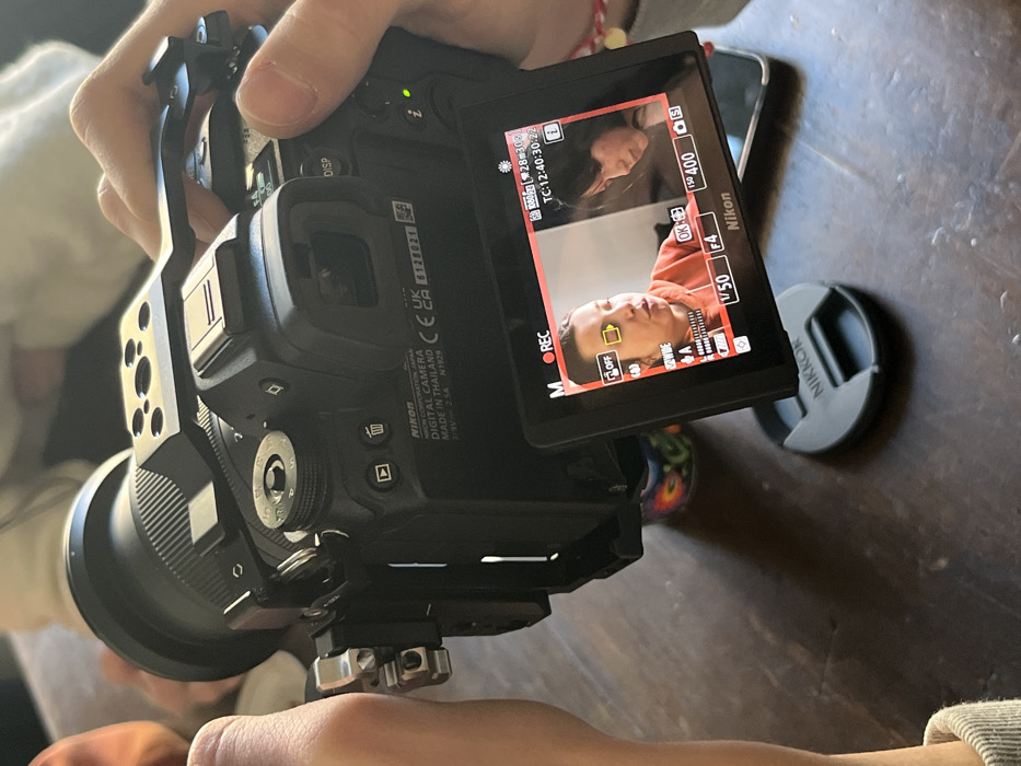 - "A close-up, eye-level image captures a person operating a black Nikon mirrorless digital camera, secured within a metal cage and fitted with a black lens" by FM-6gMpy2, licensed under CC BY 4.0
