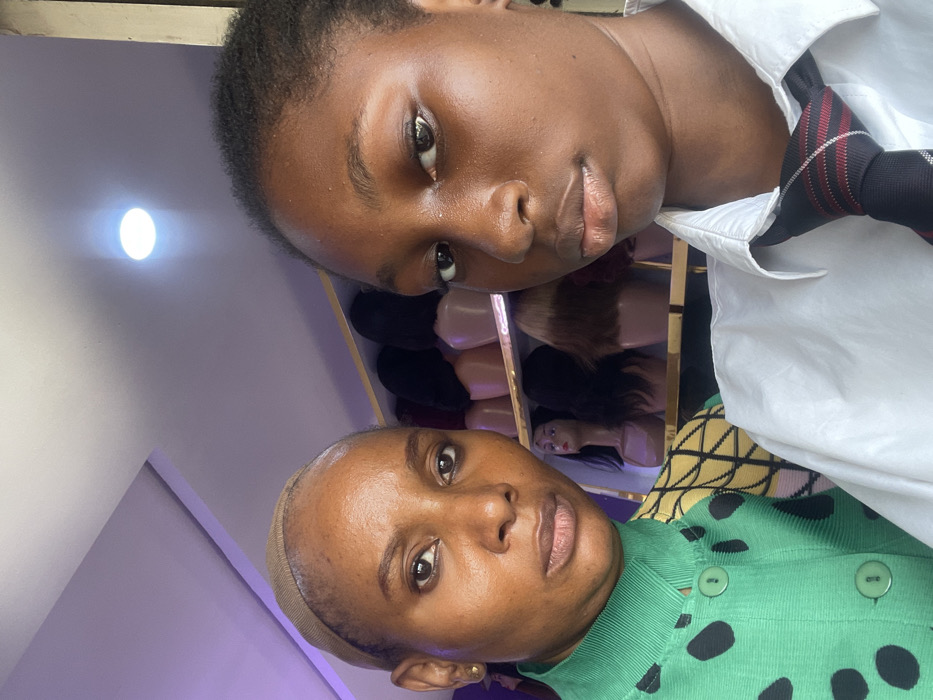 Two individuals are positioned in a close-up indoor photograph taken within a retail establishment, likely a wig shop, in Lokoja, Nigeria