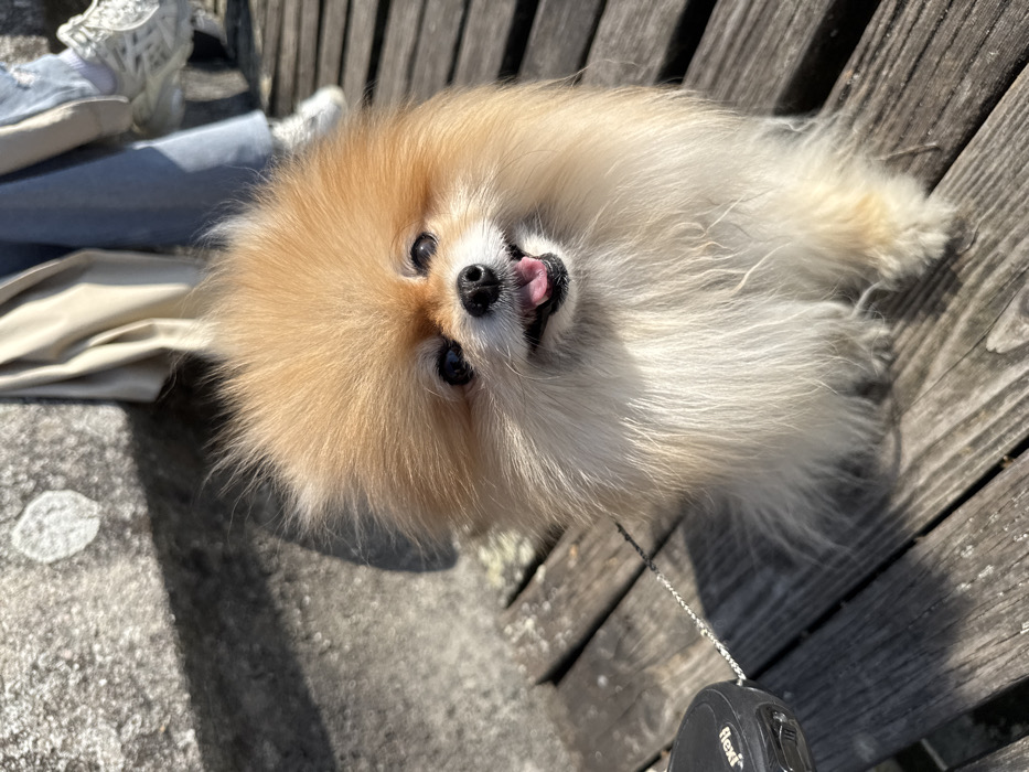 - "A light-orange and cream-colored Pomeranian dog sits on a dark wooden plank surface, facing forward and slightly left, with its mouth slightly open and tongue visible" by FM-yfpiR2, licensed under CC BY 4.0