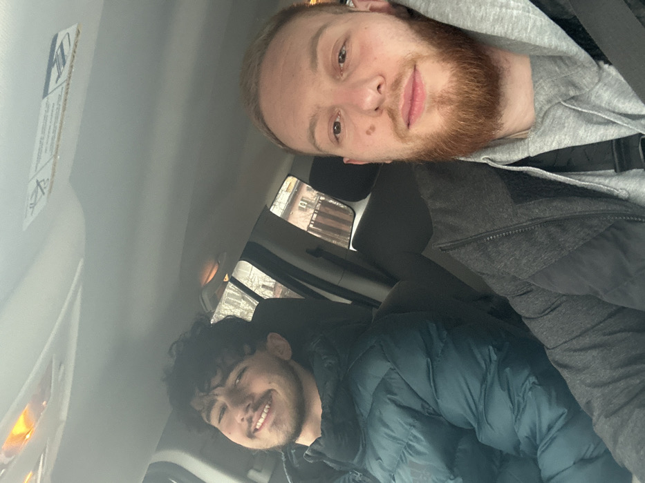 two adult males seated inside a vehicle, located within a residential area of Novi Iskar, Bulgaria. No specific landmarks are discernible to pinpoint an exact location within the city. The male on the left, occupying the front passenger seat, has dark, curly hair and a light beard. He displays a smiling expression, showing teeth, and is dressed in a dark teal or green puffer jacket. The male on the right, positioned in the driver's seat and holding the camera for the photograph, has short light-colored hair and a prominent reddish-brown beard. His expression is neutral as he faces the camera. He wears a grey hooded sweatshirt layered under a dark grey zippered jacket, with a black strap visible across his chest. The vehicle's interior features a light-colored headliner, an overhead light fixture, and a partially visible informational sticker. Dark-colored seats are apparent. Through the vehicle's windows, bare tree branches, a residential structure with a reddish-brown roof, and a wooden fence are visible, indicating an overcast daylight environment.