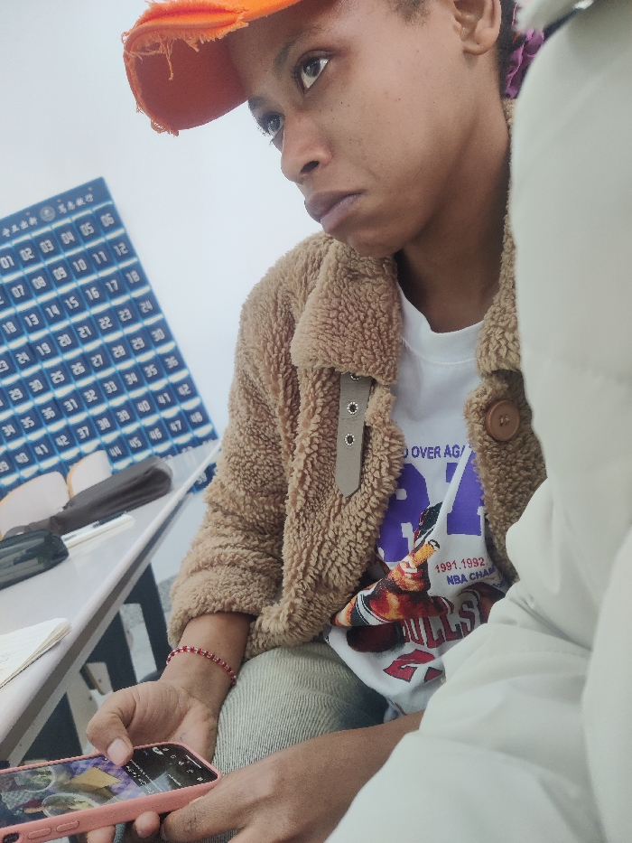 A person wearing an orange baseball cap and a brown sherpa jacket over a white graphic tee that reads "Over Again" and features imagery related to the 1991-1992 NBA championship. They are holding a smartphone in their hands. Behind them is a grid-like poster filled with numbers. A white desk with various items on it is also visible in the frame.