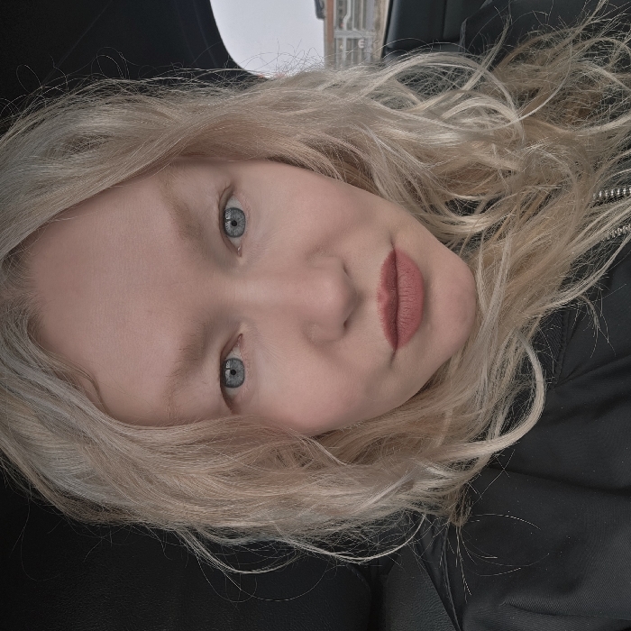 A close-up image depicts an adult female with fair skin, light blonde, wavy hair, and blue eyes. Her eyebrows are light, and her lips are colored with a reddish-brown lipstick. She wears a dark, possibly black, zippered jacket and looks directly at the viewer. The background on her left side consists of a dark, possibly leather, car seat. On her right side, an out-of-focus exterior view is visible through a window, showing an overcast sky and muted, indistinct structures consistent with a roadside or industrial environment in Kronstadt, Russia.