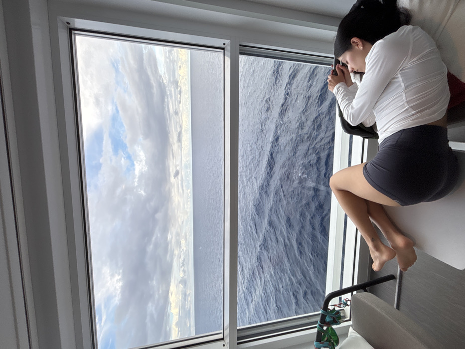 A female individual is observed resting inside a modern cabin or room, likely on a vessel, overlooking the open ocean near the Berry Islands, Bahamas