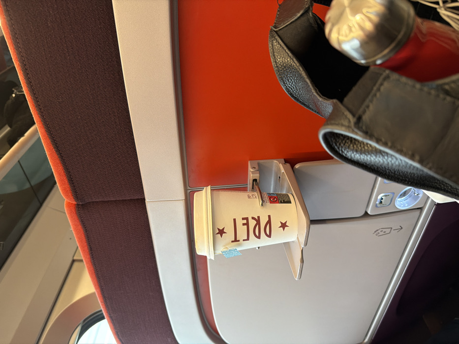 The scene depicts the interior of a modern train carriage, located within or traversing the city of Antwerp, Belgium. A white Pret A Manger disposable coffee cup with a lid, featuring the brand's maroon "PRET" logo and star motifs, rests on a light gray, extended tray table attached to the rear of a train seat. A small blue tag is visible hanging from the cup. The seat in front is characterized by maroon and orange upholstered cushions and a light gray paneling system. A prominent red panel is situated below the seat's frame. Further down, a light gray panel displays a trash disposal symbol and an illuminated circular element, likely a charging port or light. In the lower right foreground, a partially open black textured leather bag contains a red metal bottle with a silver cap. No individuals are visible.