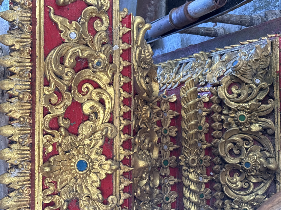 Ornate gold carvings adorn a red backdrop. The carvings feature floral motifs, swirling patterns, and small colored gem-like accents. A section exhibits repeating flower patterns running vertically. The gold finish appears aged, with some areas showing signs of wear. A metal pipe is partially visible at the top of the composition.