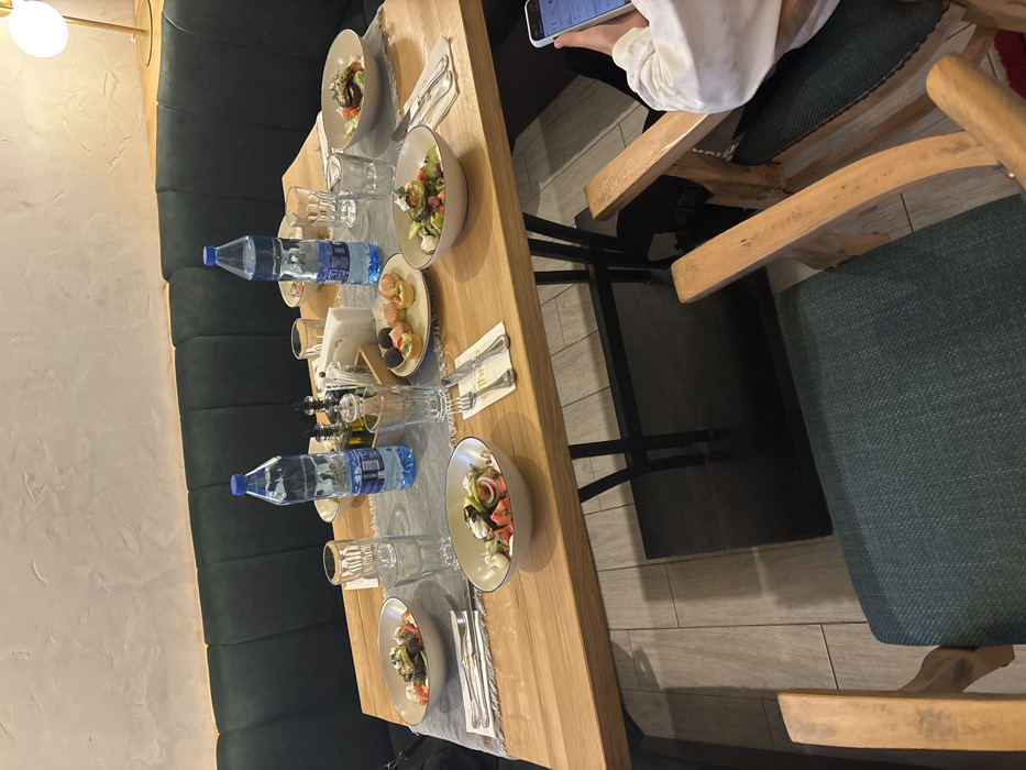 The image depicts an interior scene within a restaurant in Burgas, Bulgaria. A rectangular wooden dining table with dark metal legs is centrally positioned, set for multiple guests. The table features a light-colored fabric runner. Two large clear plastic bottles of water with blue caps are present. Multiple place settings are visible, each comprising a clear drinking glass, a fork, and a knife. Four bowls containing salads (appear to be mixed greens, tomatoes, olives, and cheese) are distributed around the table. A small white plate holds six identical canapés or small tarts with red and green toppings. A wooden condiment caddy containing salt and pepper shakers, an olive oil bottle, and a stack of white paper napkins occupies the table's center. The background features a dark green tufted upholstered bench lining a light-colored, textured wall. A warm-toned minimalist wall lamp is visible in the upper right. In the lower right foreground, a person is partially visible, seated in a wooden chair with a dark green upholstered cushion. They are wearing a white long-sleeved garment and are holding a smartphone in both hands, actively viewing its screen. Their face is not visible. The floor consists of light-toned rectangular wood-look tiles.