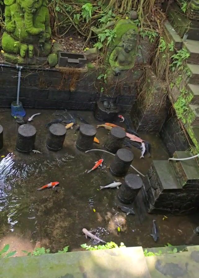 koi pond from above, enclosed by stone walls. Within the pond are several cylindrical stone columns protruding from the water's surface. A variety of koi fish in shades of orange, white, and black swim around the columns. Above the pond, there are moss-covered statues, one resembling Ganesha and another a different figure. A dense network of tree roots and greenery surrounds the pond. A broom is visible on the left side of the pond. Stone steps ascend on the right side of the pond. The environment appears lush and humid, with signs of aging and natural growth.