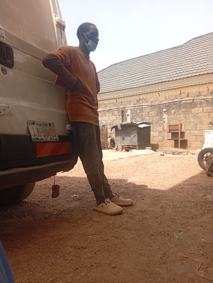 A lone male individual is depicted standing in a dusty, open-air environment in Jos, Plateau State, Nigeria. The individual is dark-skinned, has short dark hair, and wears a light blue surgical mask pulled down below his chin. He is dressed in an orange long-sleeved shirt, dark trousers, and light brown clogs. His hands are placed on his hips as he leans against the rear of a white van or truck. The van's rear left side is visible, displaying a green and white Nigerian license plate marked "PLATEAU JJS-890TA" and a strip of red and orange reflective tape on the bumper. A small, dark, irregular object hangs from beneath the vehicle's bumper. The ground consists of reddish-brown dirt. In the background, a building with a grey tiled roof and a light brown wall topped with barbed wire is present. Adjacent to it, a rough concrete block wall is visible. Further back, a small, makeshift metal structure, possibly a shack, and various pieces of debris, including a discarded tire and metal components, are scattered. A partial view of a vehicle wheel is visible on the far right. The sky is bright and clear, indicating daylight, and shadows are cast from the man and the vehicle.