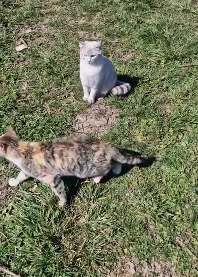 two cats in a grassy area. One cat, a light gray color with darker markings, is sitting upright. The second cat, a mix of gray, brown, and black, is lying on its back with its paws in the air. The light gray cat stands up and walks a short distance. The grass is a mix of green and brown. The weather appears to be sunny.