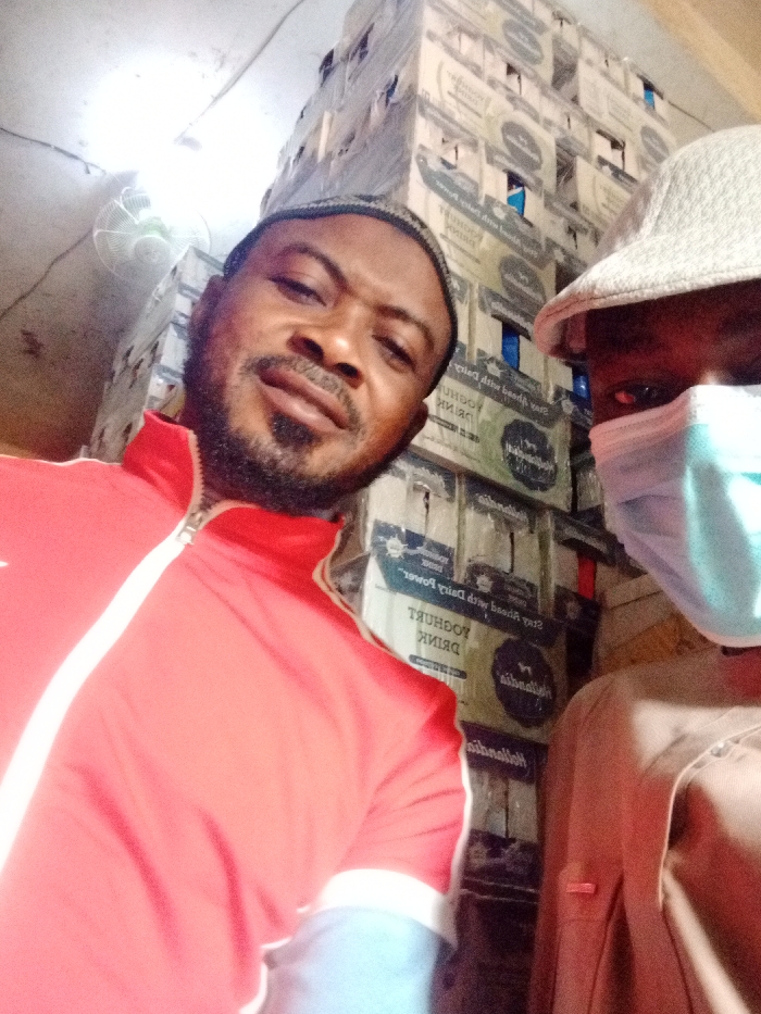 Two men stand close in a cramped room. One, in a red tracksuit, is positioned in the foreground, looking at the camera. Behind him and to the right, the other man wears a light-colored hat and a disposable face mask. Stacks of cartons with "YOGURT DRINK" printed on them rise in the background, nearly reaching the ceiling. A small fan is visible on the wall to the left. The lighting is dim, suggesting an enclosed, possibly storage space.