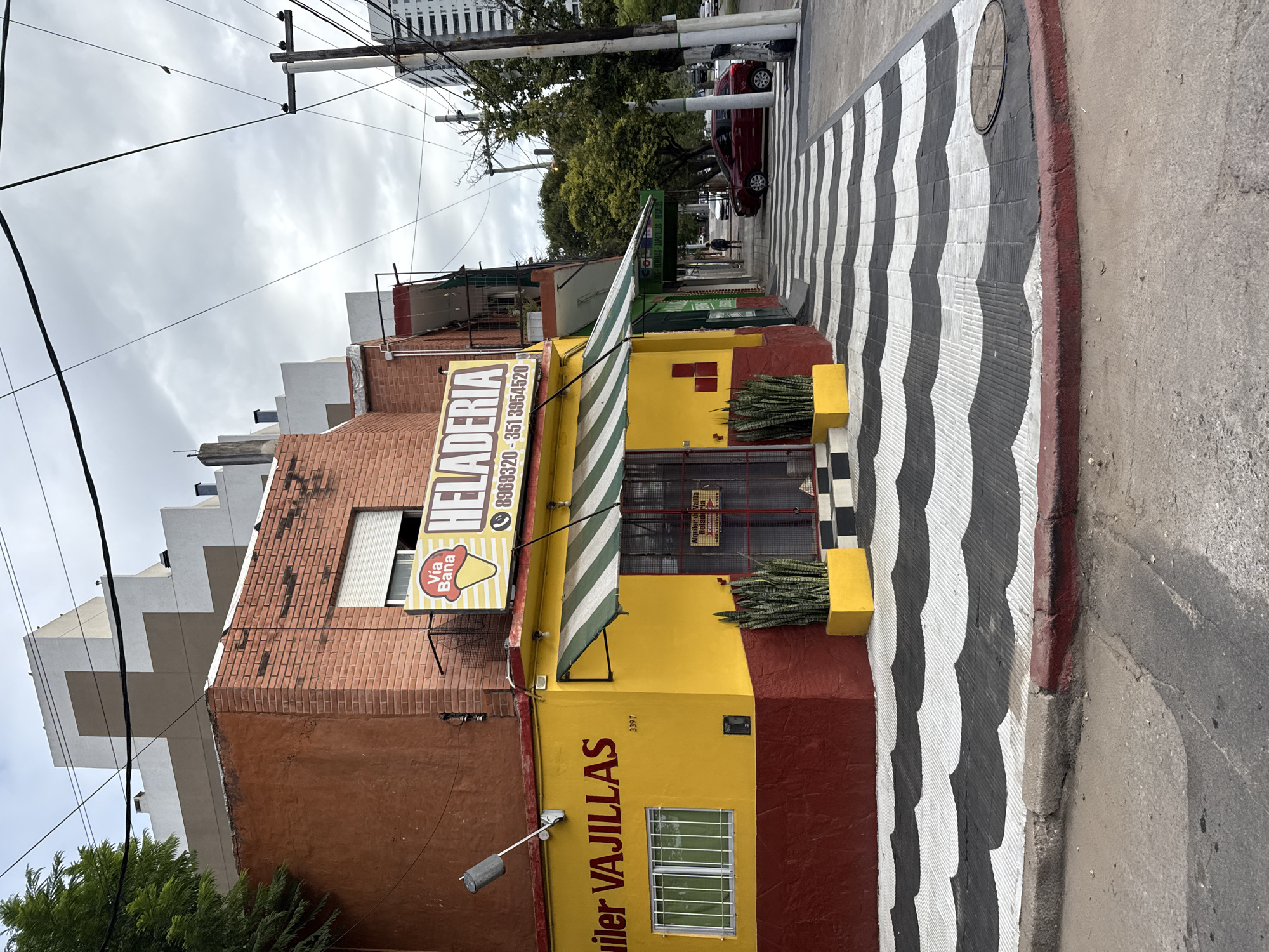 The image depicts an urban street corner in Cordoba, Argentina, under an overcast sky. The prominent building on the corner is a two-story structure. Its lower portion is painted bright yellow with a dark red base, featuring a green and white striped awning over an entrance. A sign above this entrance prominently displays "HELADERIA" (Ice Cream Shop) with an ice cream cone logo that reads "Vía Baña," along with phone numbers: 8969320 and 351 3954520. On the adjacent yellow wall, facing left, a sign reads "Alquiler VAJILLAS" (Tableware Rental) next to two barred windows, with the building number "3397" visible. A silver-colored lamp fixture extends from this wall. Two yellow rectangular planters containing snake plants are positioned near the Heladeria entrance. The upper story of the corner building is constructed of red brick, and above it, a modern building with stepped white and grey rectangular sections rises against the sky. The sidewalk encompassing the corner is distinctive, paved with black and white tiles arranged in a wavy or scalloped pattern. A curb, painted red and grey, separates the sidewalk from the asphalt street. A circular metal manhole cover is present on the patterned sidewalk near the curb. Numerous black utility wires crisscross the upper portion of the frame, connected to a prominent wooden utility pole on the right. Further down the street, a red hatchback car is parked curbside. A single individual, dressed in dark clothing, walks away from the camera on the patterned sidewalk, partially obscured by green trees that line the street. Additional distant buildings and vehicles are visible, contributing to an urban environment.