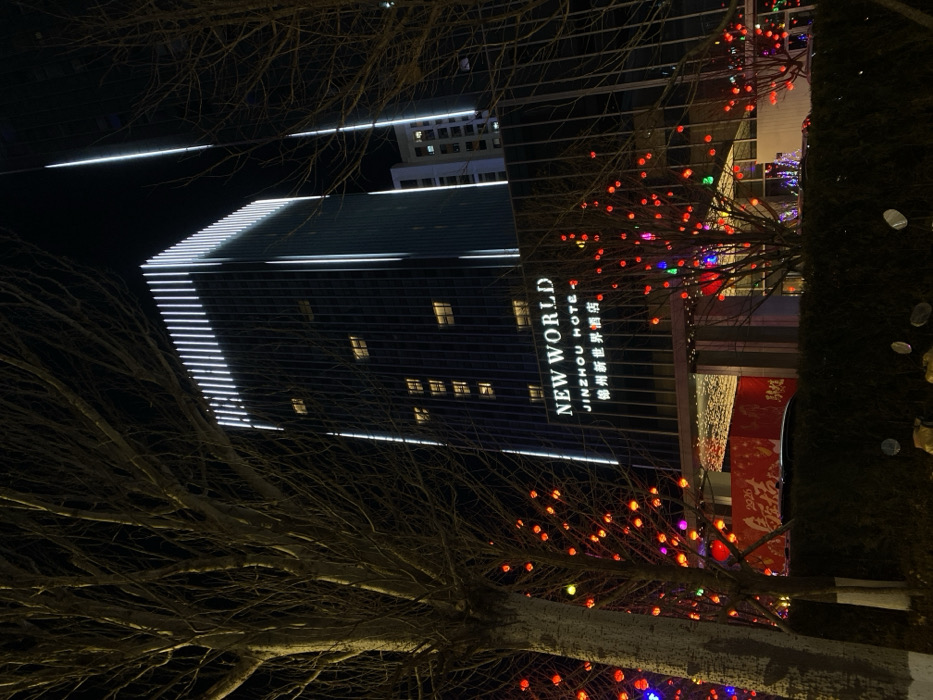 The image captures a nighttime urban scene in Taihe District, Jinzhou, China. The focal point is the "NEW WORLD JINZHOU HOTEL" (锦州新世界酒店), a tall, modern high-rise building with a dark facade. The building is prominently outlined and illuminated by white vertical and horizontal LED strip lights, particularly along its edges and roofline. Multiple windows across various floors display interior illumination. In the foreground, several leafless deciduous trees are heavily decorated with numerous small, round, multicolored lights, primarily red, resembling festive lanterns. A dark green hedge line runs beneath these decorated trees. Partially obscured by the trees and hedge, at the ground level of the hotel, a large red banner with Chinese characters and the numerical inscription "2026" is visible. A dark vehicle is also partially visible near the hotel's entrance. Circular, reflective objects are present on the ground below the hedge. No individuals are visible.
