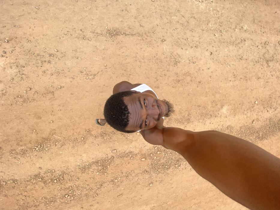 An overhead, high-angle photograph depicts a male individual, appearing to be of African descent, standing on reddish-brown, dry earth with scattered pebbles. The man, with short dark hair and a short beard, is wearing a white sleeveless top and a single visible green/grey flip-flop on his left foot. He is looking directly up towards the camera with a smile. A dark-skinned arm, presumably his own, extends from the left side of the frame towards the camera, indicating a selfie perspective. The scene is located in Nguzu Edda, Nigeria.