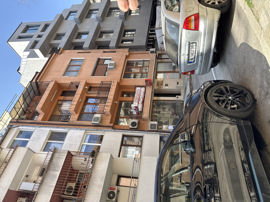 The image captures an urban street scene in Varna, Bulgaria, under direct sunlight, featuring a row of diverse multi-story buildings and two parked vehicles. In the immediate foreground, a black BMW i3 is partially visible on the left, showing its front-left side and wheel. To its right, a silver Opel Astra hatchback is parked, presenting its rear towards the viewer, displaying Bulgarian license plate "B 1437 PP," which designates Varna as the registration city. The background is dominated by three distinct buildings. On the left, a multi-story building with a light-colored, possibly white or pale grey, facade exhibits multiple balconies with simple metal railings and several externally mounted air conditioning units. Adjacent to it, a multi-story building with an orange or peach-colored facade features balconies with darker railings, numerous windows, and additional air conditioning units. The ground floor of this building houses commercial establishments, with a red and white banner sign visible above a window, displaying text in Bulgarian, possibly advertising a legal or real estate service. To the right of the orange building, a modern, grey, multi-story structure with a pronounced geometric, layered design and numerous windows stands. A partial human hand is visible entering the frame from the right side, at mid-height. The sky is clear blue, and strong sunlight creates defined shadows across the street and buildings. No other individuals are visible, and no dynamic actions or interactions are occurring.