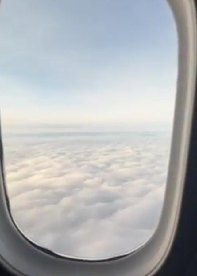 The view from an airplane window shows a dense layer of clouds stretching to the horizon under a pale blue sky