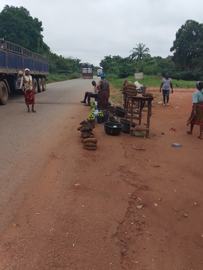 This image depicts a roadside market scene in Ejule, Nigeria, under an overcast sky