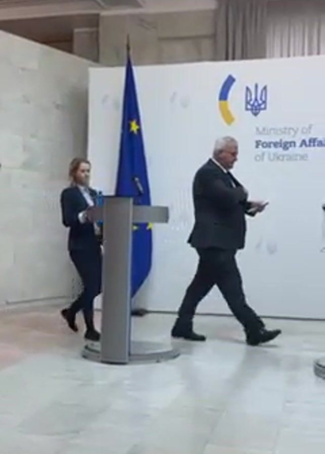A woman and a man walk toward two podiums. They are in a room with a background that says, "Ministry of Foreign Affairs of Ukraine" on it, along with the flag of the European Union and part of the Ukrainian flag. The woman stands at the podium on the left and the man stands at the podium on the right. The woman adjusts the microphone at her podium.