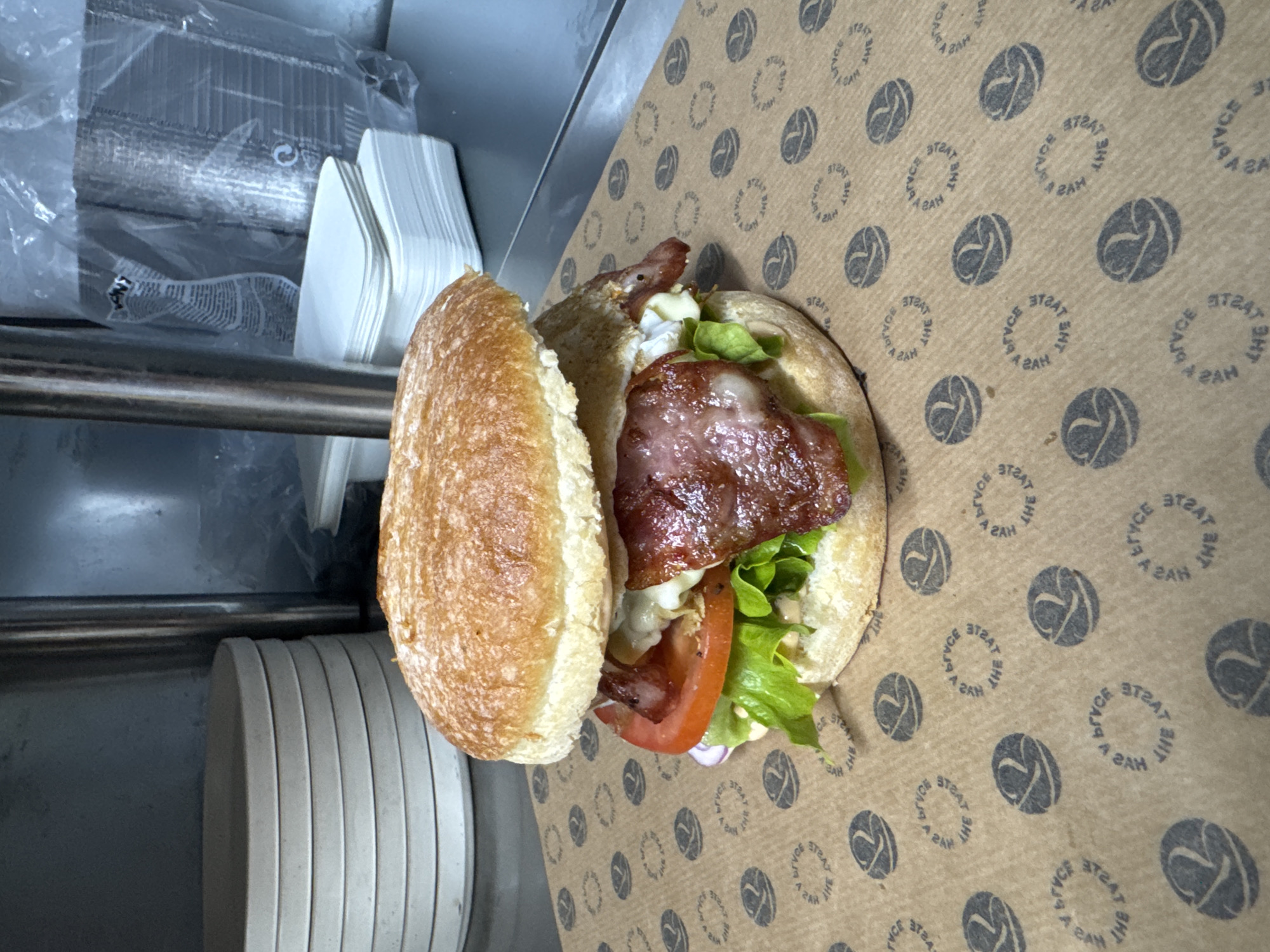 Here's a detailed description of the image: **Scene:** The image shows a sandwich, likely a bacon sandwich or BLT, positioned on a patterned piece of paper. **Objects:** * The sandwich consists of a golden-brown bun, bacon slices, lettuce, tomato, and what appears to be a creamy sauce or mayonnaise. * The sandwich sits on a brown paper surface with a repeating circular design containing some text. * There's a metal bar visible, along with a stack of white plates and wrapped utensils, suggesting a food service or food preparation area. **Environment:** The setting appears to be an indoor food preparation or service area, possibly within a restaurant, deli, or catering environment. **Location:** The city and country are not identifiable in the image.
