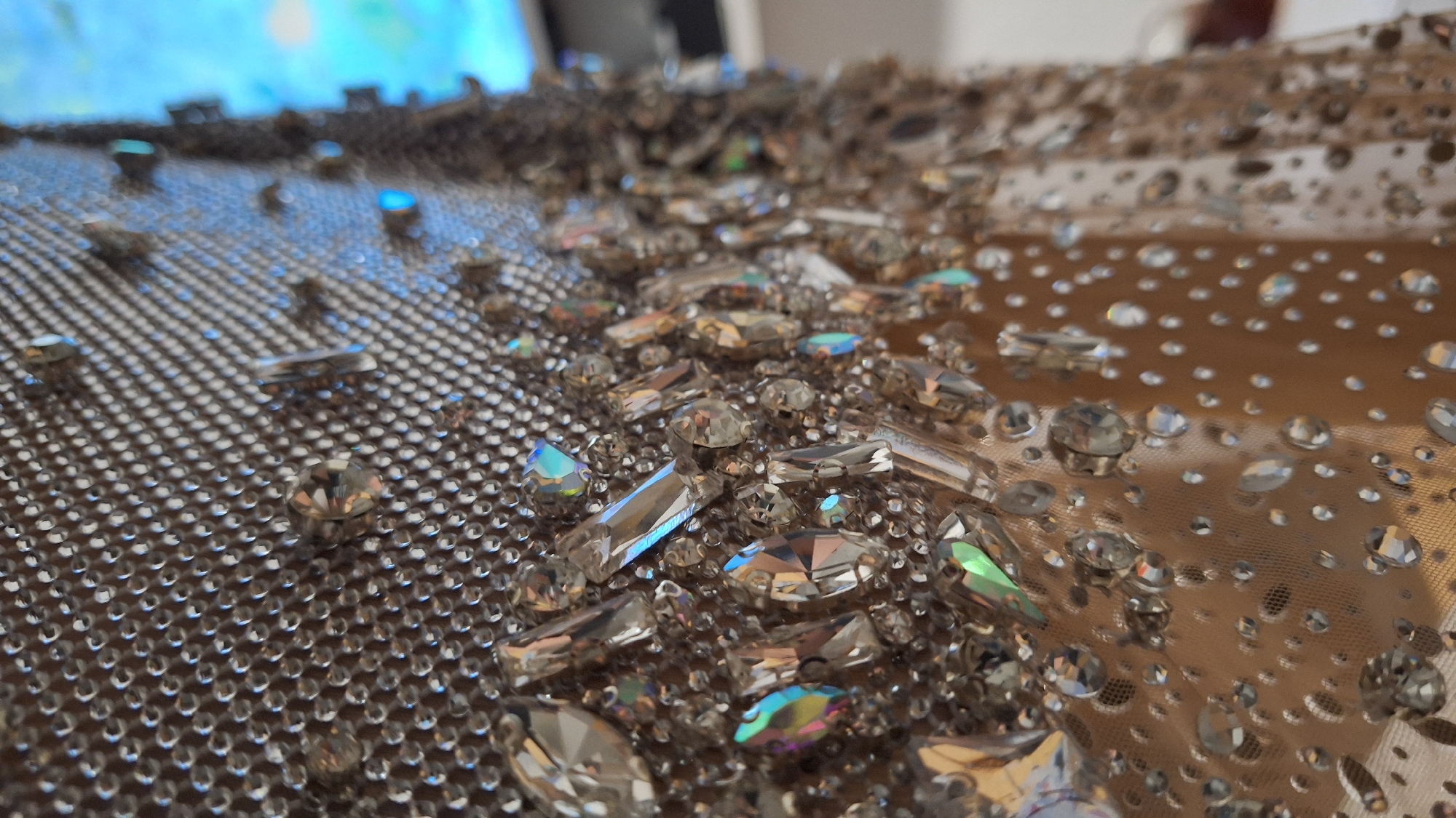 close-up view of a garment adorned with various sized rhinestones and crystals