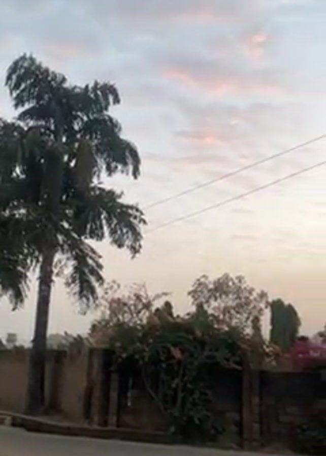 The scene shows a street view with a cloudy sky tinged with pink