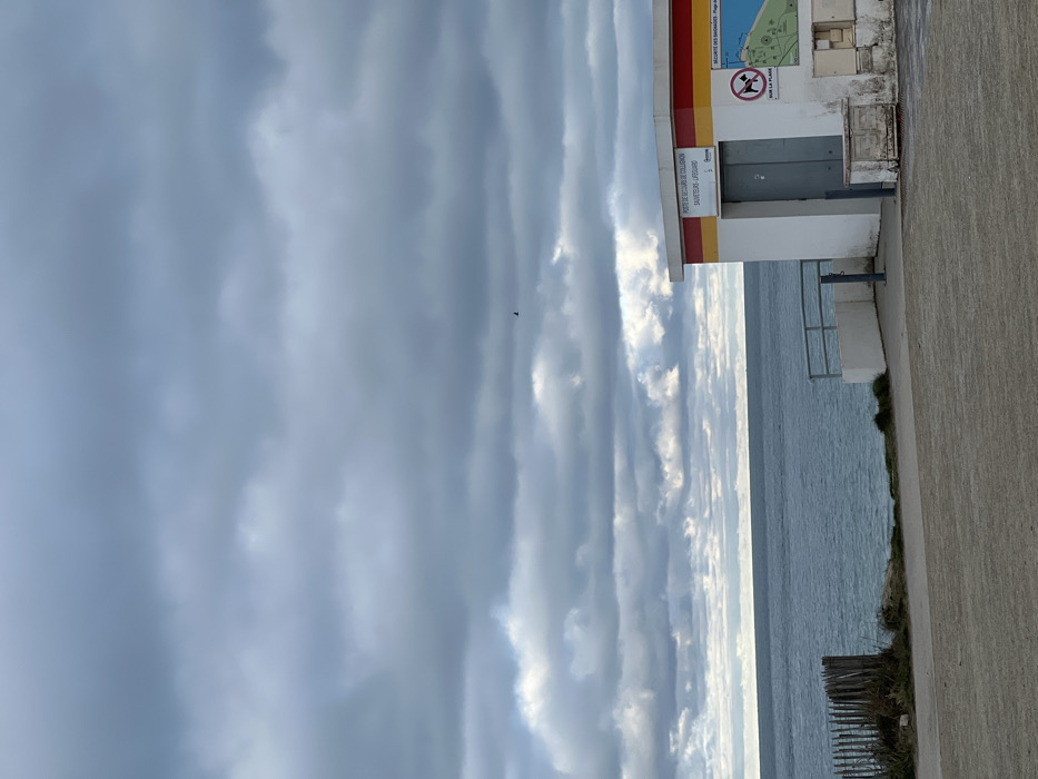 The image displays a coastal scene under overcast conditions at Collignon Beach, Cherbourg-en-Cotentin, France. The upper two-thirds of the frame are dominated by a dense grey, cloudy sky. A small, dark avian silhouette is visible in flight in the upper center portion of the sky. A distinct horizon separates the cloud cover from the calm, dark blue-grey ocean surface, which spans the mid-frame. In the left foreground, a weathered wooden picket fence stands amidst dry vegetation, delineating a gentle incline towards the water. The right foreground features a white, single-story rectangular building, identified by signage as a "POSTE DE SECOURS DE COLLIGNON SAUVETEURS - LIFEGUARD" (Collignon Lifeguard Station). This structure features horizontal red and yellow banding near its roofline. A grey double door is centrally positioned on its visible facade. To the right of the door, a white sign with a red circle and diagonal line over a dog icon indicates "No Dogs," alongside a map titled "SÉCURITÉ DES BAIGNADES - Plage de Collignon" (Bathing Safety - Collignon Beach). The building's base shows weathering and discoloration. A metal handrail extends from the building's left side towards the ocean. The immediate foreground consists of a flat, light-colored gravel path. No human subjects are present in the scene.
