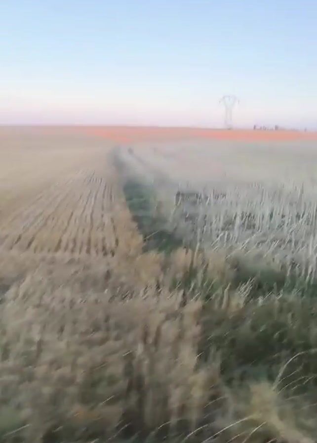 low angle, moving shot of a harvested field under a light blue sky. There are power lines and utility poles visible in the distance. The field is mostly dry, with some green patches and leftover stalks. The camera appears to be moving along a dirt path bordering the field.